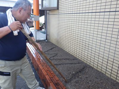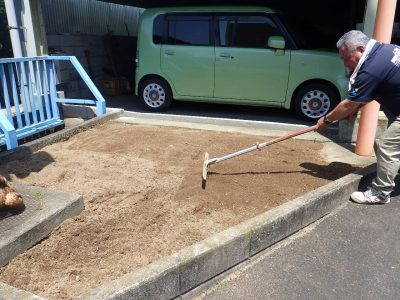 さすが舗装屋、レーキを持つと目つきが変わる(笑)